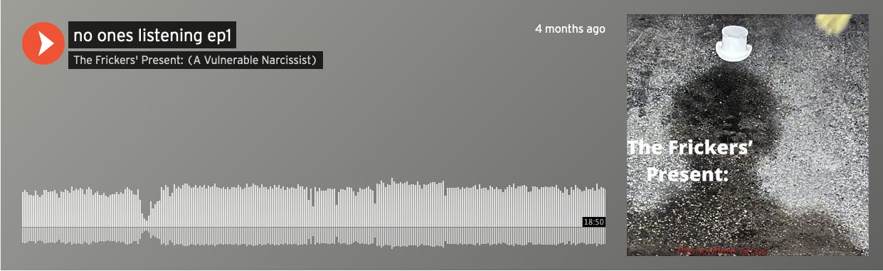 Jordan could make music. He went from being a bass player in our legendary high school band: Gluten Free, to its rebrand as The Narrows, to composing and recording his own music as The Frickers’ Present (A Vulnerable Narcissist). He put everything into his most recent songs, layering sounds and his voice to kind of take you inside his head to show you what it might sound like in there. He released a lot of music over the past couple years and I have been having a hard time with it because his spoken-word that he uses a lot makes it sounds like he’s right there with you. I wish I listened to more of it while he was alive so I could talk to him about it and how it moved me but I cannot now. I like “No ones listening ep1” it is a hard listen for me to but I believe it captures Jordan.